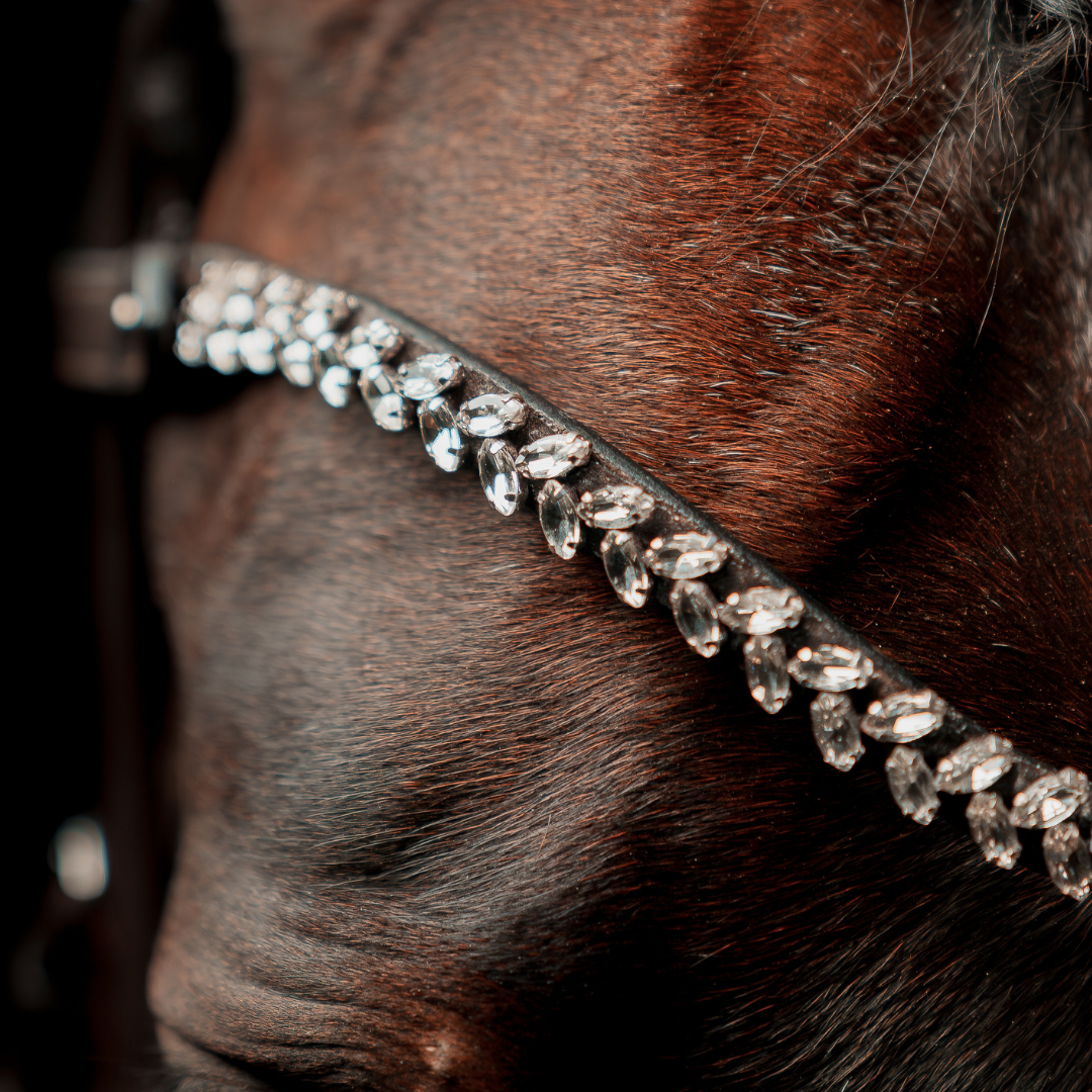 An elegant browband inspired by Roman flower crowns. The large, clear stones are set closely together in a beautiful pattern, creating an exclusive and feminine look.