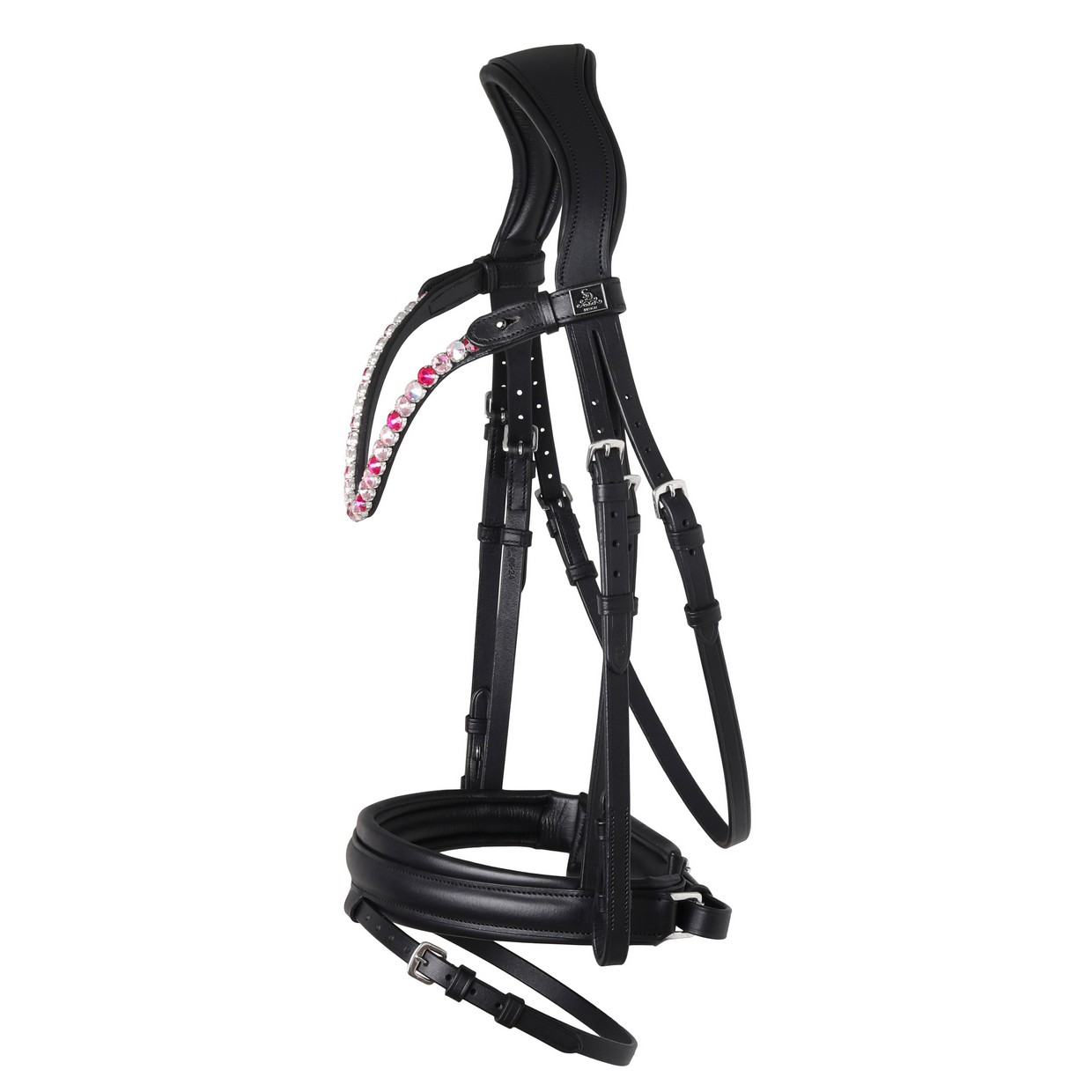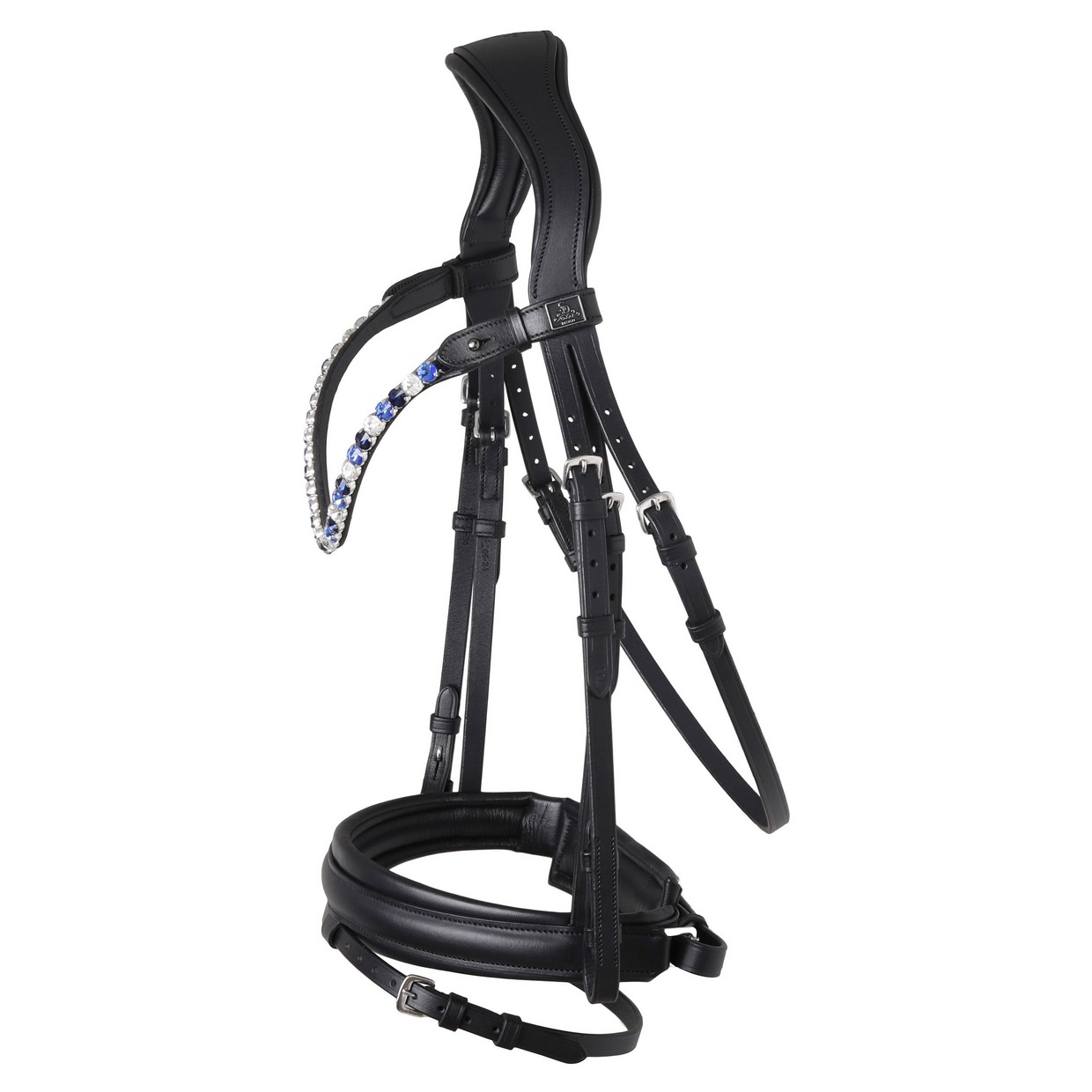 You get a SD bridle with a browband you design yourself. The bridle comes with silver buckles and silver casings/holders for the crystals on the browband. The bridle looks like the first picture. Black with black padding.