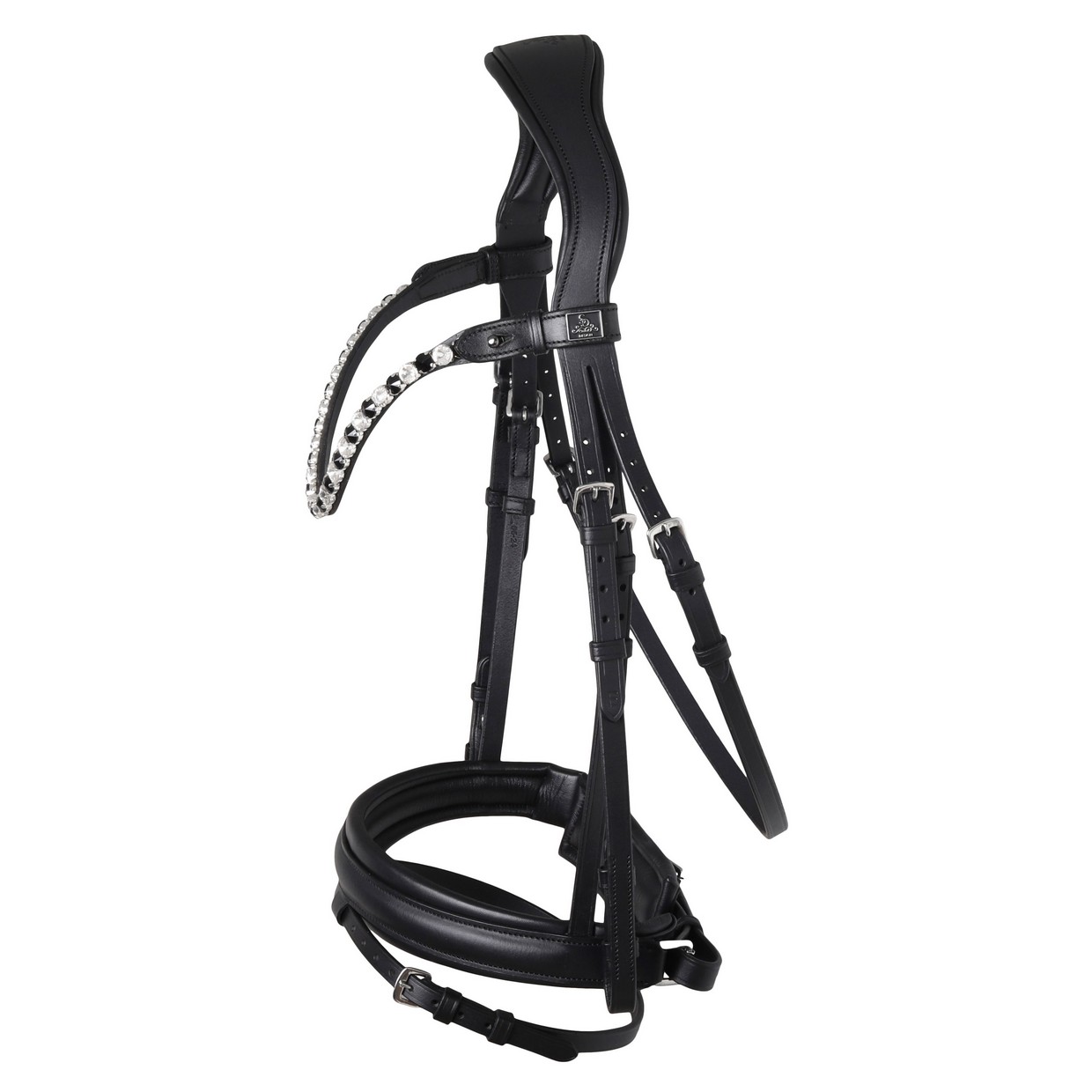 You get a SD bridle with a browband you design yourself. The bridle comes with silver buckles and silver casings/holders for the crystals on the browband. The bridle looks like the first picture. Black with black padding.